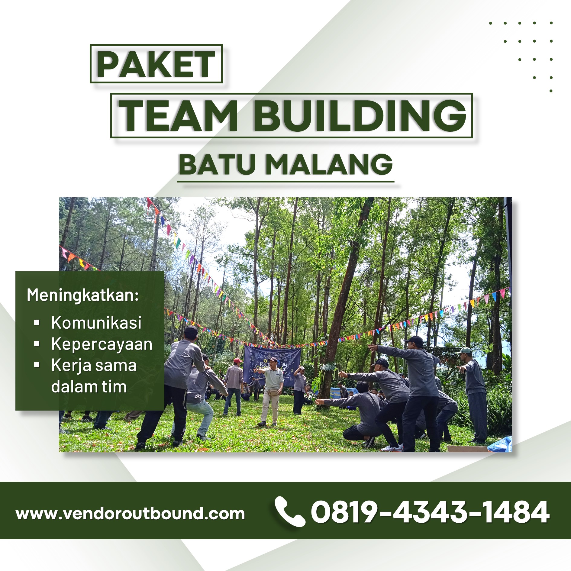 Hub 0819-4343-1484, Batu Malang, kota yang memadukan keindahan alam dan suasana pegunungan yang menenangkan, telah menjadi destinasi unggulan untuk berbagai kegiatan outbound. Tidak hanya menawarkan keindahan alam, tetapi juga Fasilitas Jasa Outbound Lengkap di Batu Malang yang siap memberikan pengalaman tak terlupakan. Dengan fasilitas modern, tenaga profesional, dan program yang dirancang khusus, Anda dapat menikmati kegiatan outbound yang seru sekaligus bermanfaat.