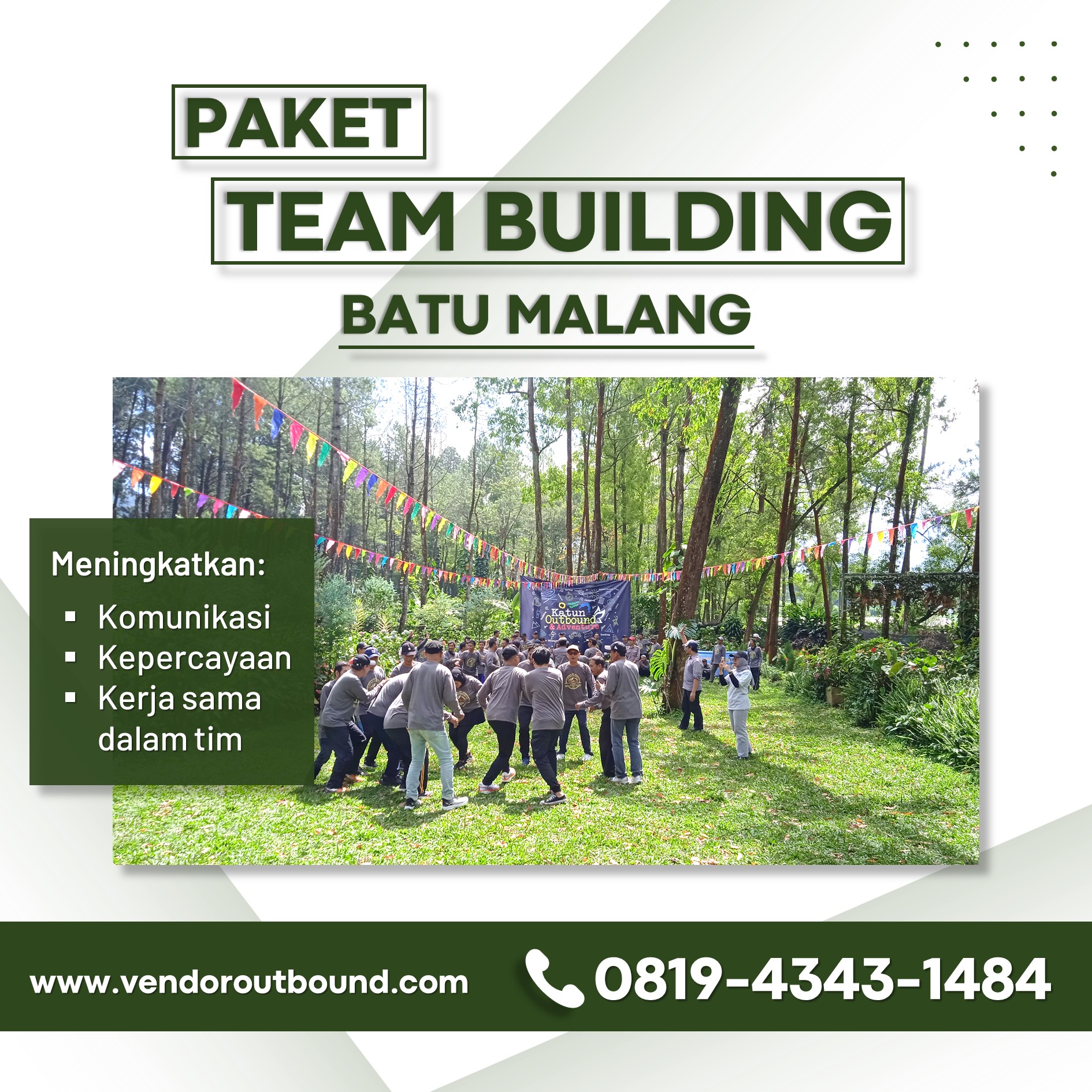 Nikmati paket team building 2 hari di Malang yang dirancang untuk memberikan hasil yang nyata dalam memperkuat ikatan tim. Dengan pengalaman yang menyenangkan dan bermanfaat, kegiatan ini akan meninggalkan kesan mendalam bagi setiap peserta. Untuk mendapatkan informasi lebih lanjut dan memesan paket ini, hubungi 0819-4343-1484. Temukan cara baru untuk menginspirasi dan memotivasi tim Anda di Malang, dan ciptakan pengalaman yang tak terlupakan.
