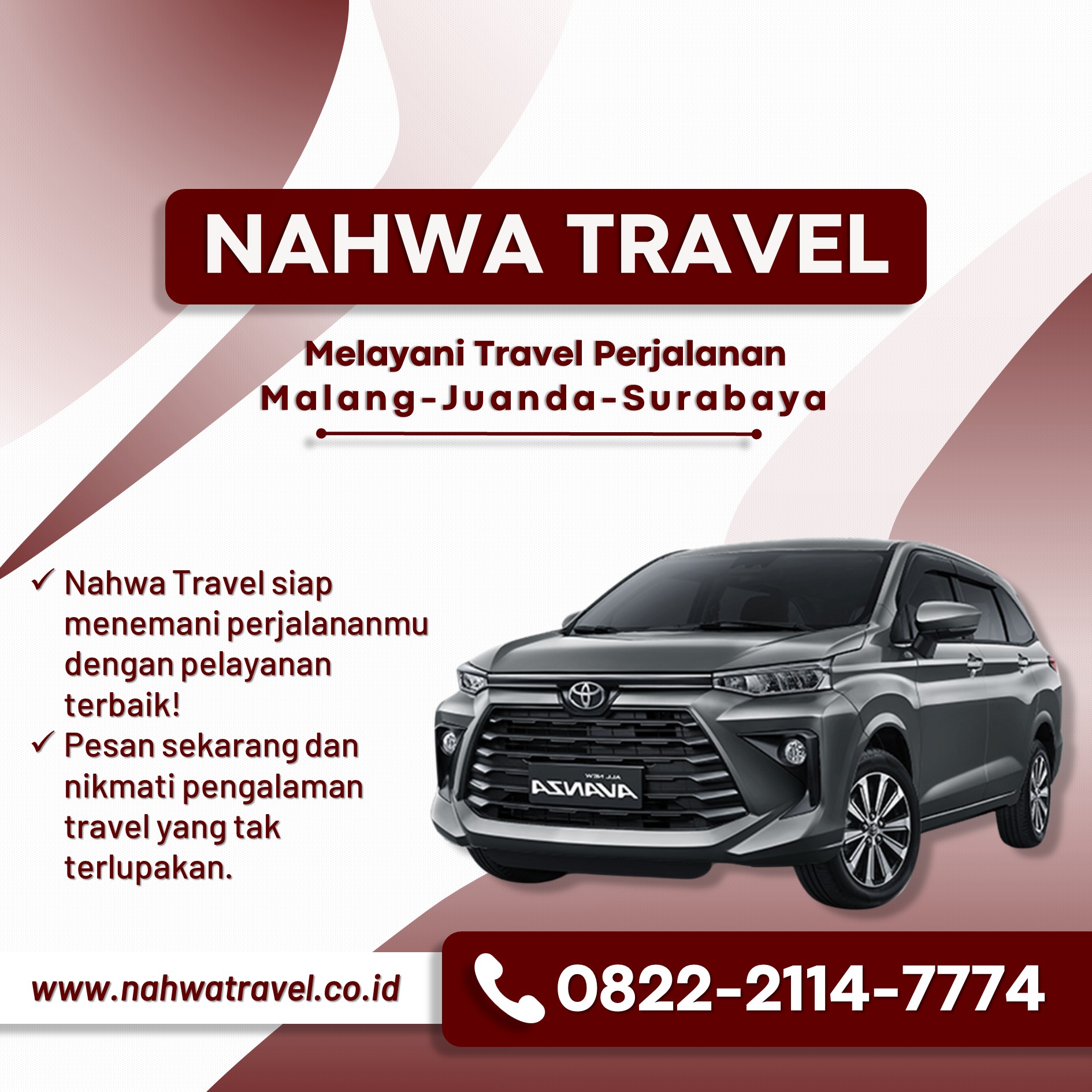 Percayakan kebutuhan perjalanan Anda pada NAHWA TRAVEL, penyedia layanan travel yang mengutamakan kepuasan dan keselamatan penumpangnya. Hubungi 0822-2114-7774 untuk melakukan reservasi dan dapatkan layanan penjemputan yang terjamin kualitasnya. Dengan NAHWA TRAVEL, setiap perjalanan Anda menjadi lebih dari sekadar perjalanan—ini adalah pengalaman yang dihadirkan dengan profesionalisme dan dedikasi tinggi.