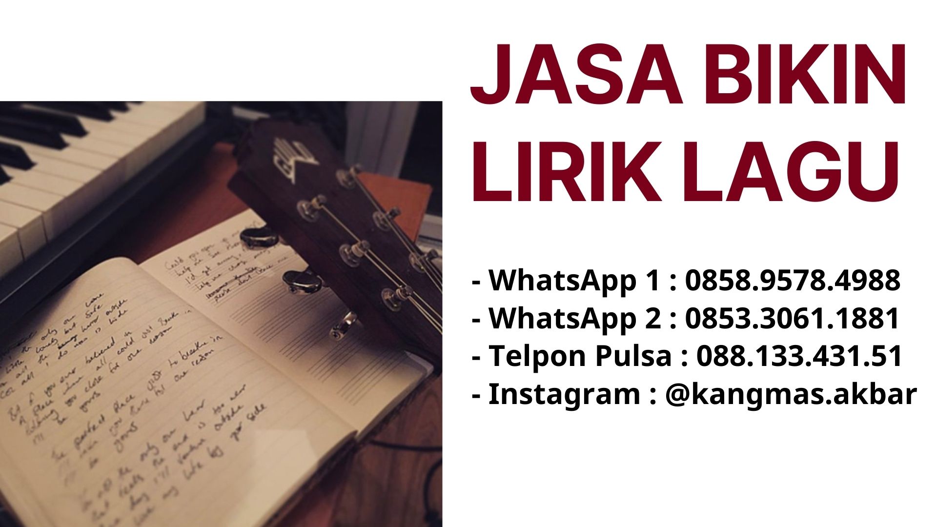 Mas Akbar siap membuatkan lirik lagu untuk berbagai genre musik (Indie, Jazz, Reggae, EDM, Hiphop, Keroncong, Pop, Rock, Dangdut)