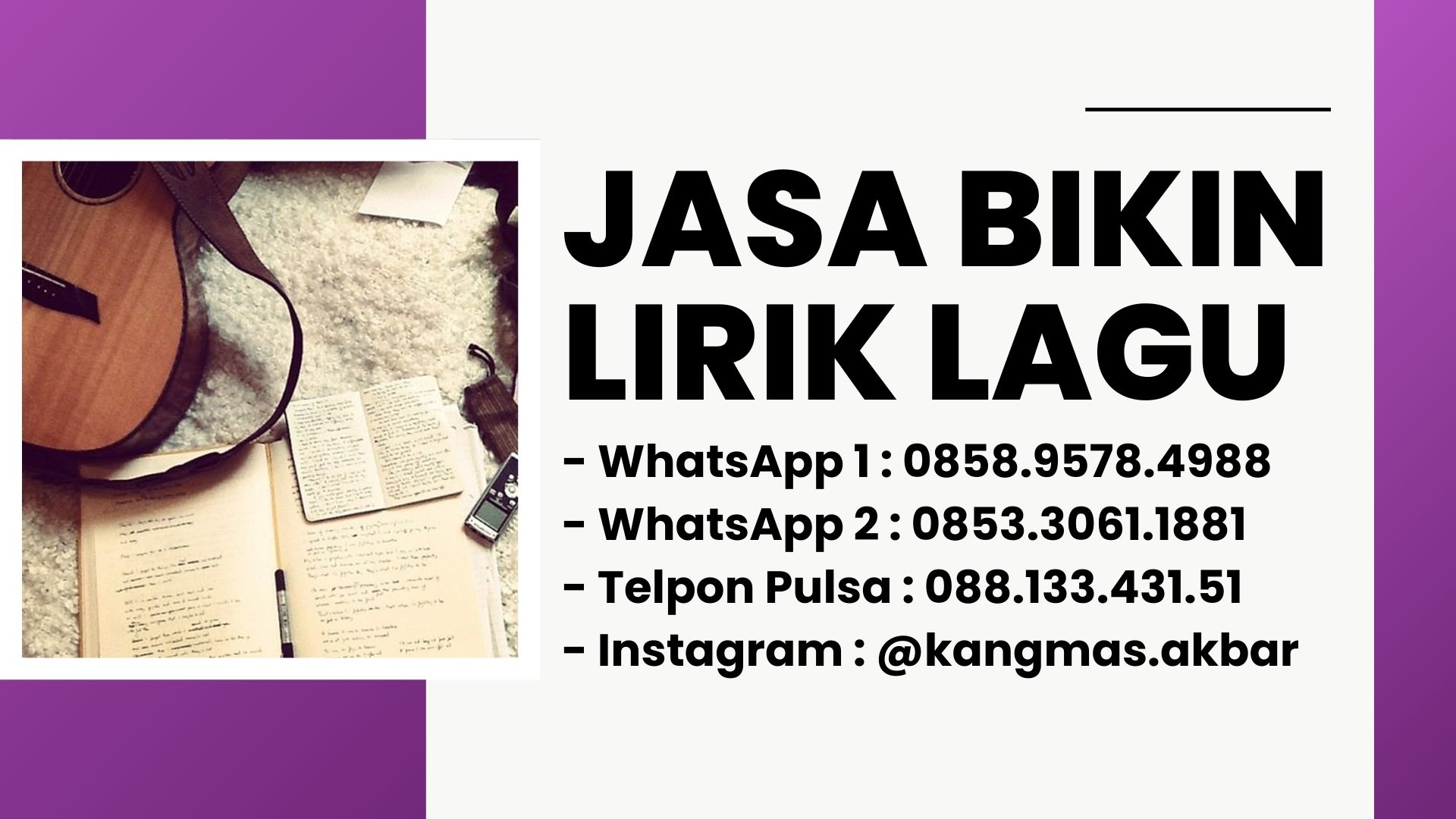 Mas Akbar siap membuatkan lirik lagu untuk berbagai genre musik (Indie, Jazz, Reggae, EDM, Hiphop, Keroncong, Pop, Rock, Dangdut)