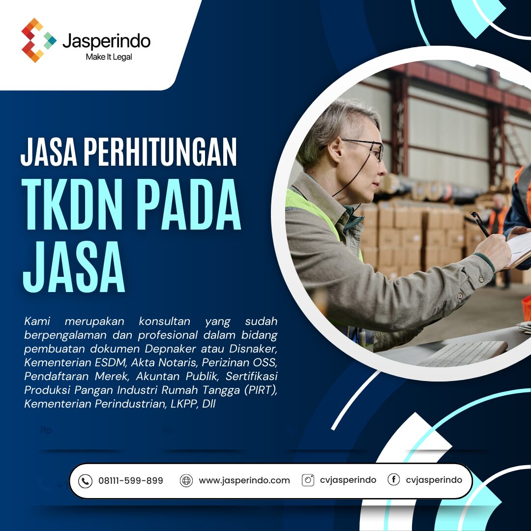 Perhitungan komponen TKDN jasa memperhitungkan kewarganegaraan tenaga kerja, alat & fasilitas kerja, serta jasa umum yang digunakan dalam melakukan jasa yang diperdagangkan. Biaya yang diperhitungkan ialah keseluruhan biaya yang dikeluarkan untuk menghasilkan jasa yang dihitung sampai di lokasi pengerjaan (On Site).
