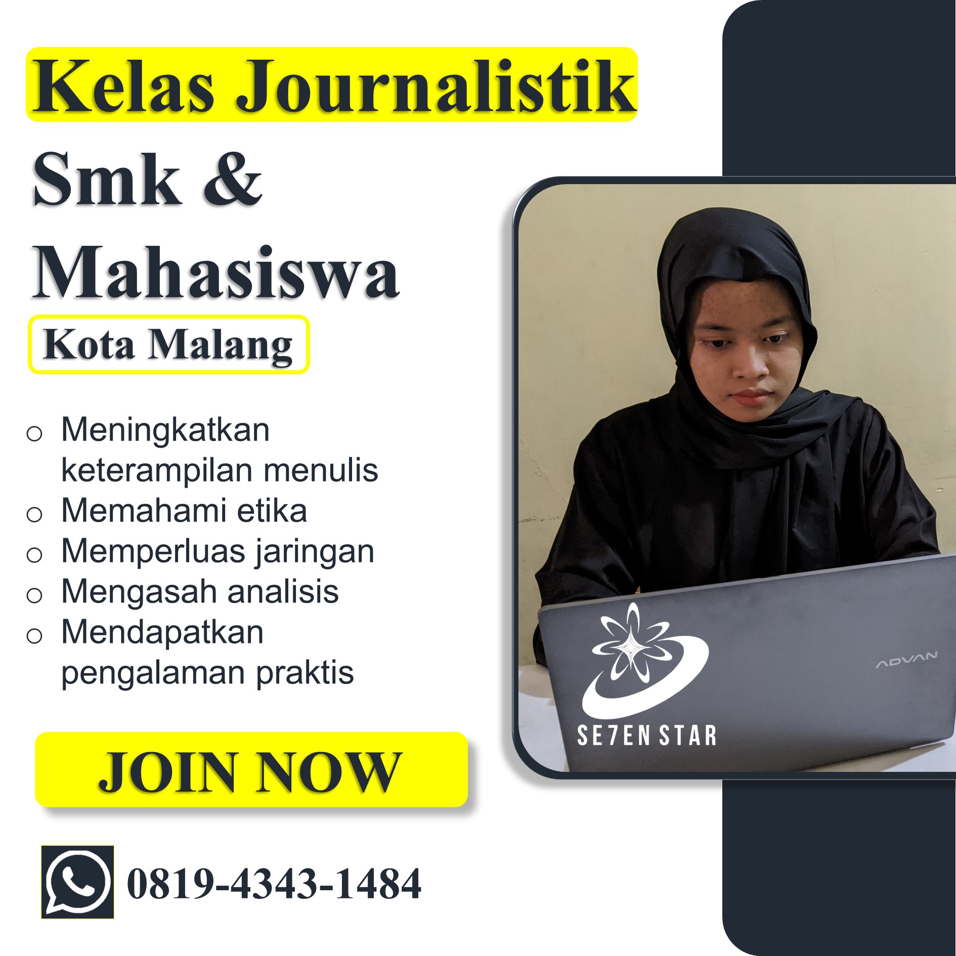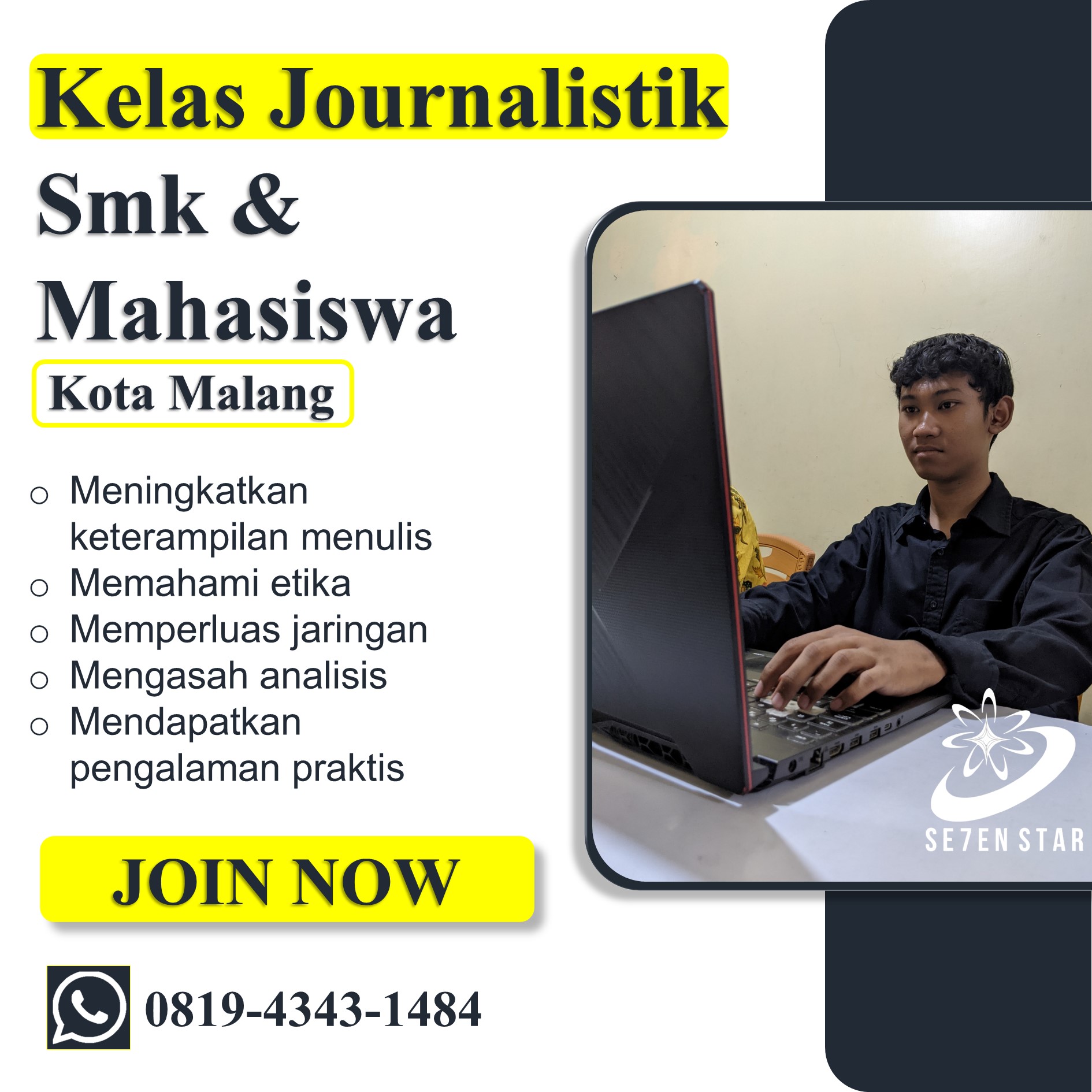 Jangan tunda lagi kesempatan ini! Untuk informasi lebih lanjut atau pendaftaran, hubungi kami di 0819-4343-1484 dan mulai langkah pertama Anda menuju karir jurnalistik yang sukses.