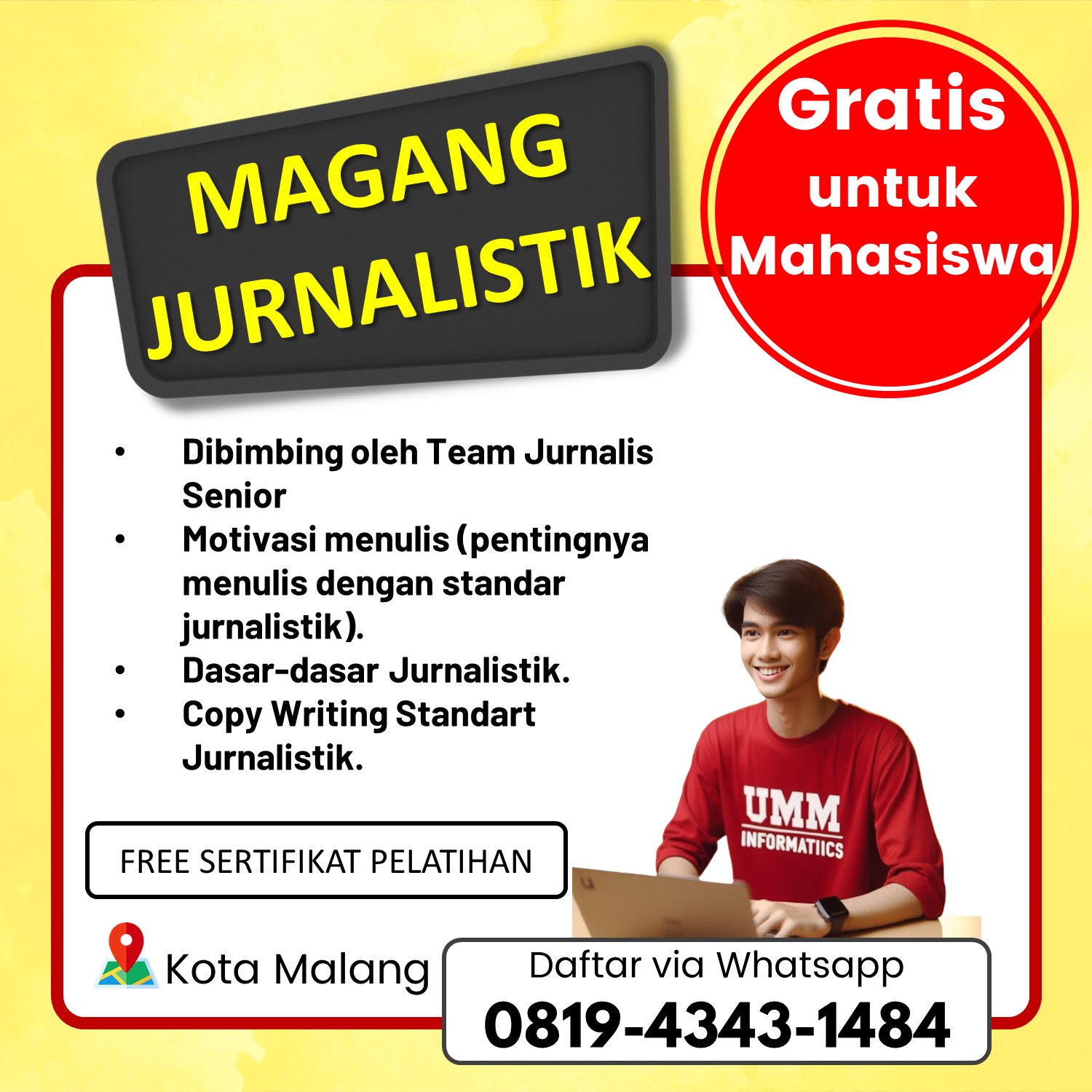 Segera bergabung dan manfaatkan kesempatan ini untuk meningkatkan kompetensi Anda. Untuk informasi pendaftaran dan detail program, hubungi 0819-4343-1484. Jangan ragu untuk mengambil langkah besar menuju karier jurnalistik yang sukses.