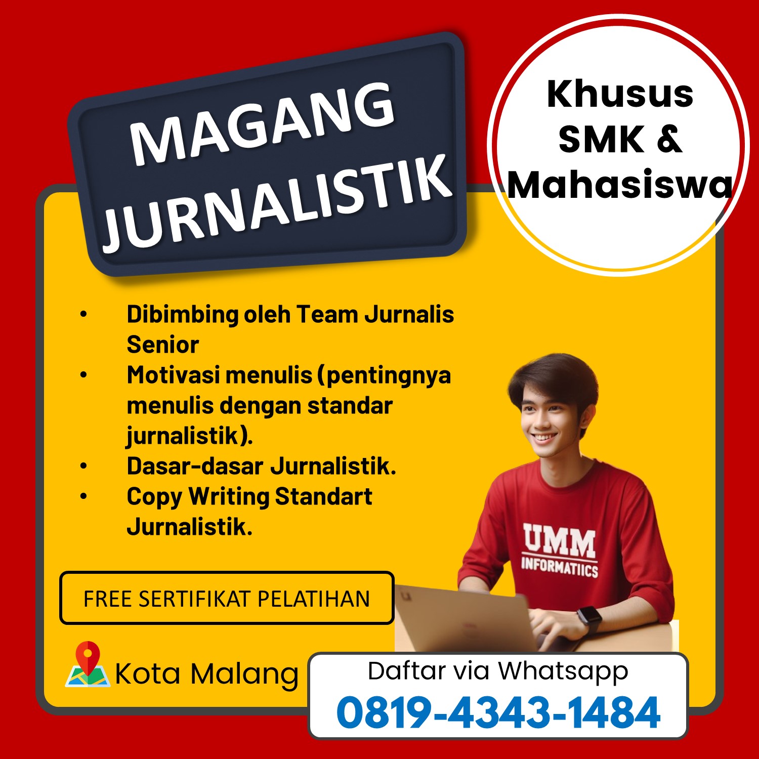 Untuk informasi lebih lanjut mengenai pelatihan ini, hubungi 0819-4343-1484 dan temukan kesempatan terbaik untuk mengembangkan keterampilan jurnalistik Anda.