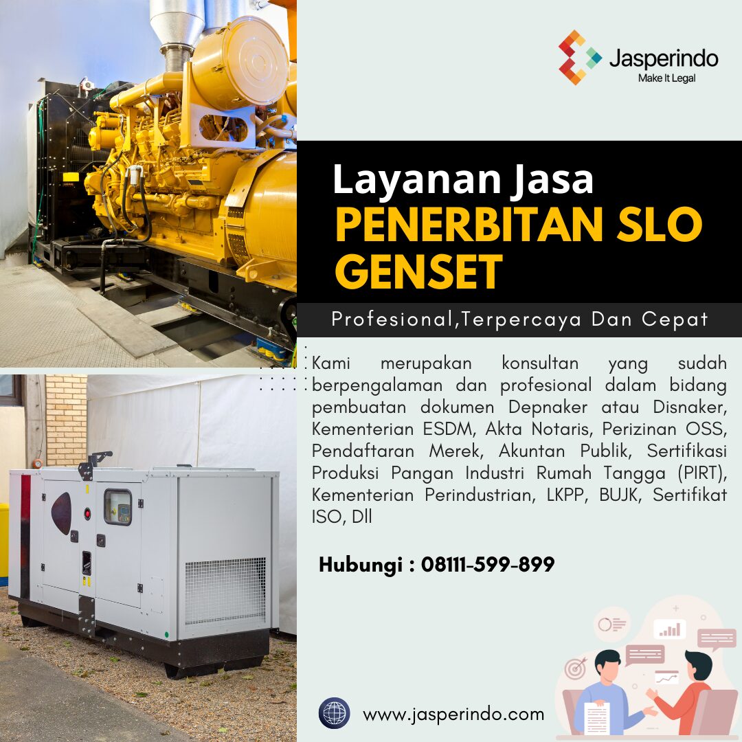 Sertifikat Laik Operasi (SLO) genset merupakan dokumen resmi yang menyatakan bahwa sebuah generator set (genset) telah memenuhi standar keselamatan dan kinerja yang ditetapkan oleh otoritas terkait. Sertifikat ini diterbitkan oleh Lembaga Inspeksi Teknik (LIT) yang telah diakui oleh Kementerian Energi dan Sumber Daya Mineral (ESDM).