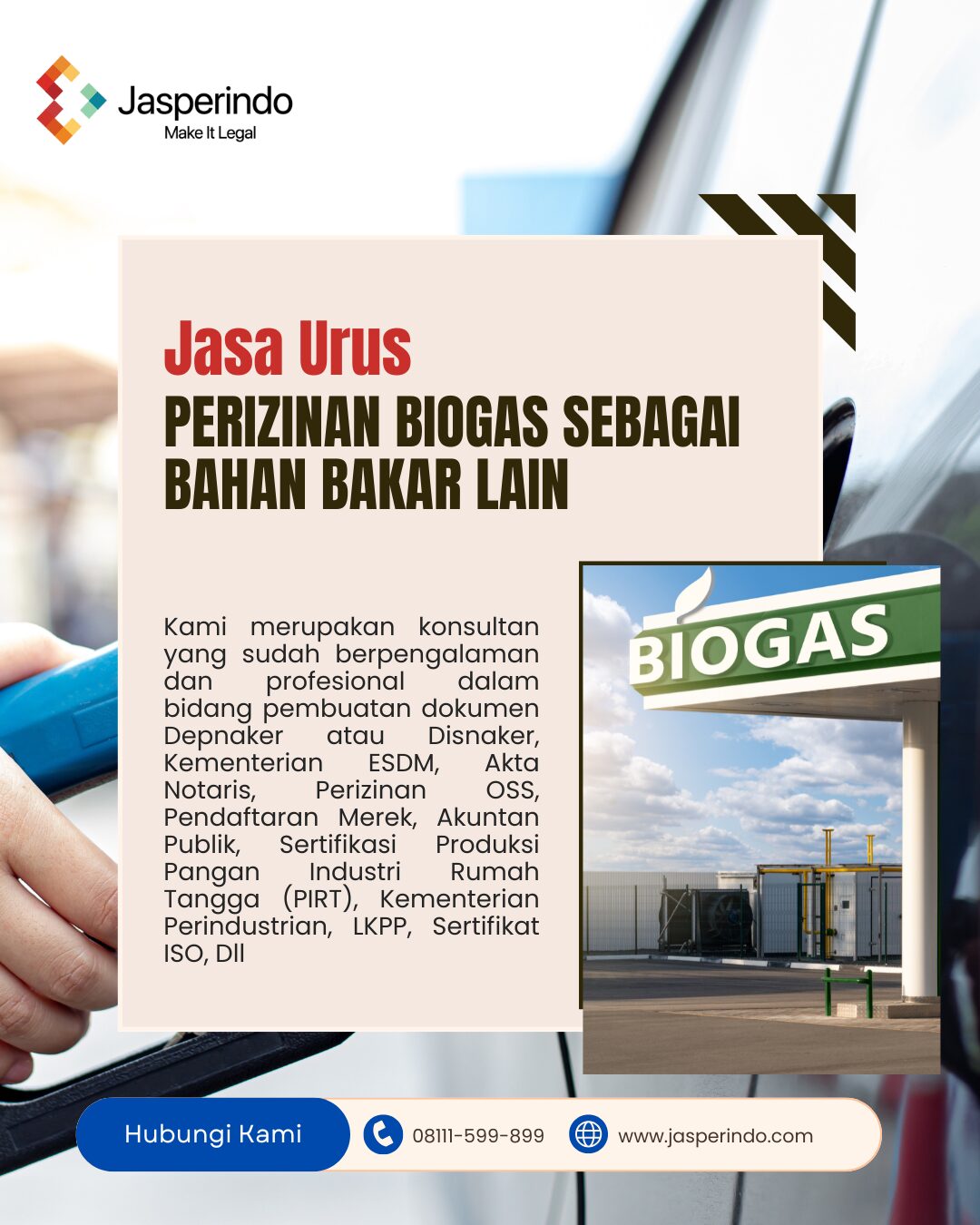 Perizinan biogas sebagai bahan bakar lain di Indonesia telah dipermudah dan diringankan melalui sistem OSS Kementerian Investasi/BKPM, dengan peluncuran KBLI 35203 pada 9 Maret 2023. Perizinan ini bertujuan untuk mendorong pemanfaatan biogas sebagai energi alternatif dan mendukung pengembangan bisnis di sektor biogas, termasuk biogas upgrading (pengolahan menjadi biometana).
