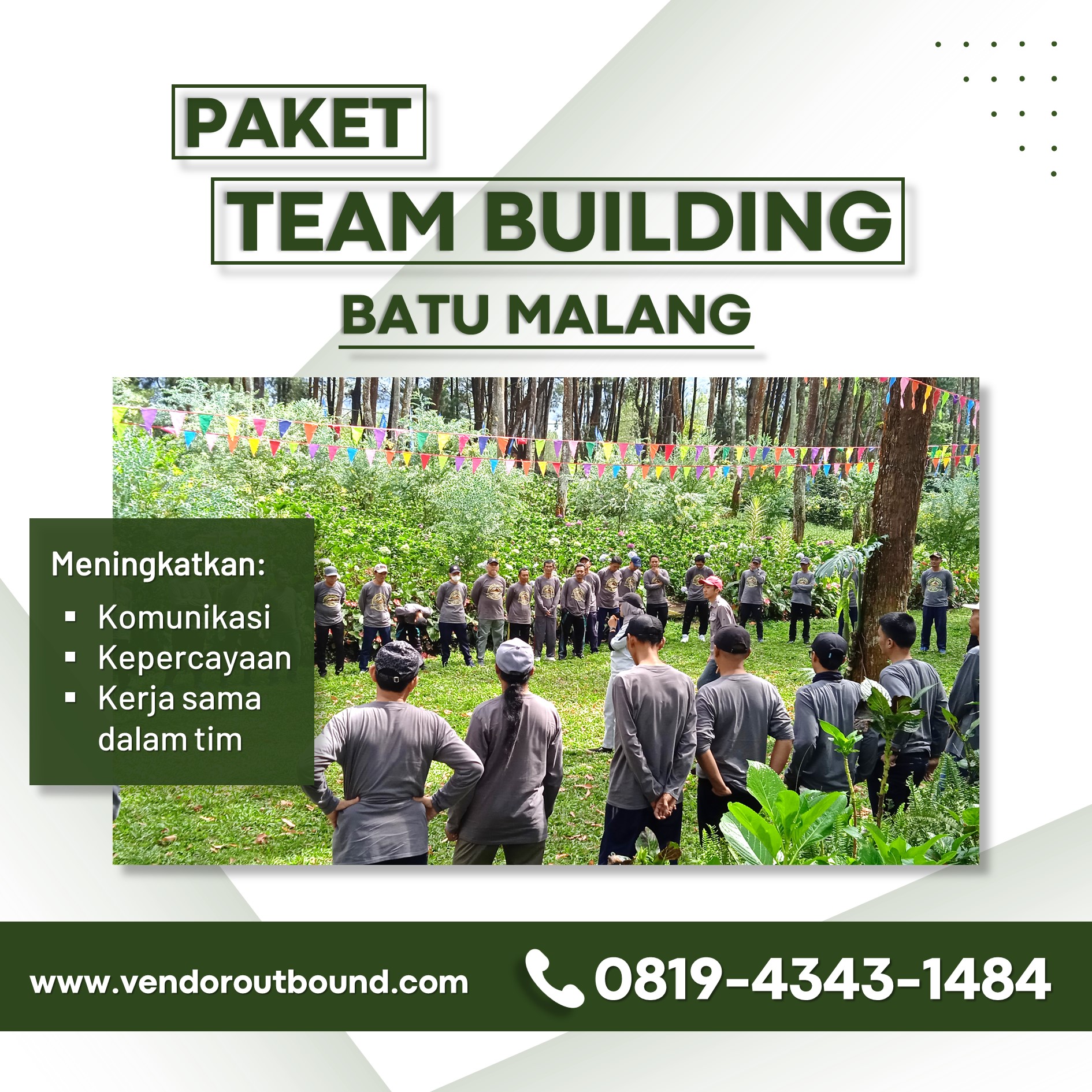 Bagi Anda yang ingin mengadakan acara outbound di Batu Malang, kami siap memberikan Temukan provider outbound terbaik di Batu Malang untuk acara Anda! Layanan profesional yang siap memenuhi segala kebutuhan tim. Hubungi kami untuk rekomendasi! Dengan pengalaman bertahun-tahun dalam menyelenggarakan berbagai kegiatan outbound, provider yang kami rekomendasikan telah terbukti mampu memberikan layanan yang memuaskan dan hasil yang signifikan bagi setiap tim.