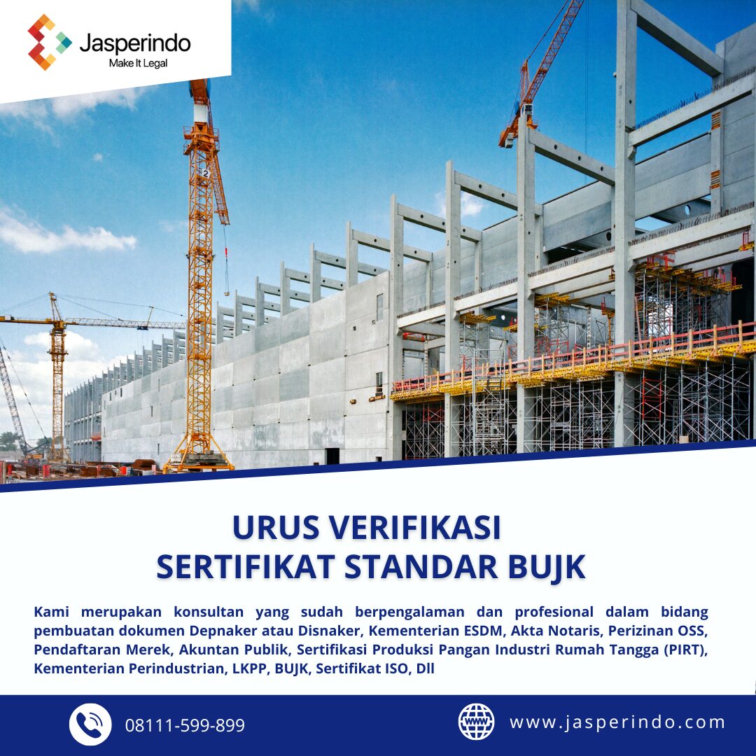 Verifikasi sertifikat standar Badan Usaha Jasa Konstruksi (BUJK) merupakan bagian dari proses pengajuan sertifikasi atau lisensi Standar Jasa Konstruksi. Berikut adalah beberapa hal yang perlu diketahui terkait verifikasi sertifikat standar BUJK: