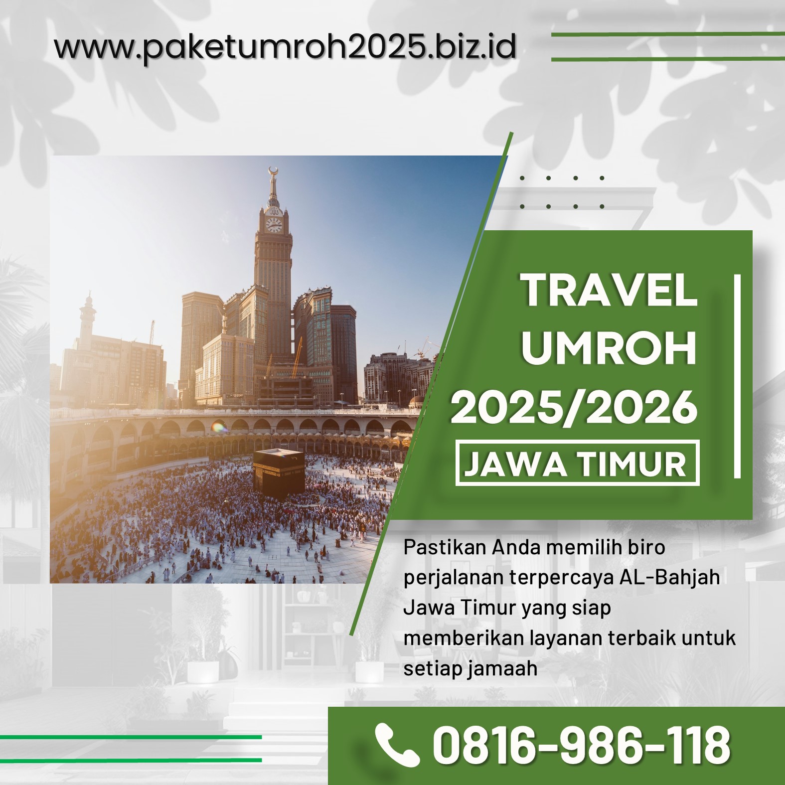 WA 0816-986-118,Paket Umroh Eksklusif 2025 Sukun Malang AL Bahjah menjadi pilihan utama bagi umat Muslim yang menginginkan perjalanan ibadah penuh berkah dan kemewahan. Menawarkan berbagai keunggulan, paket ini adalah solusi terbaik untuk ibadah Anda, menggabungkan kenyamanan, kualitas, dan pelayanan terbaik yang memastikan pengalaman ibadah yang tak terlupakan. AL Bahjah, yang sudah terkenal dengan reputasinya dalam melayani jemaah umroh, menghadirkan paket dengan fasilitas unggulan, memberikan kenyamanan yang maksimal sepanjang perjalanan.