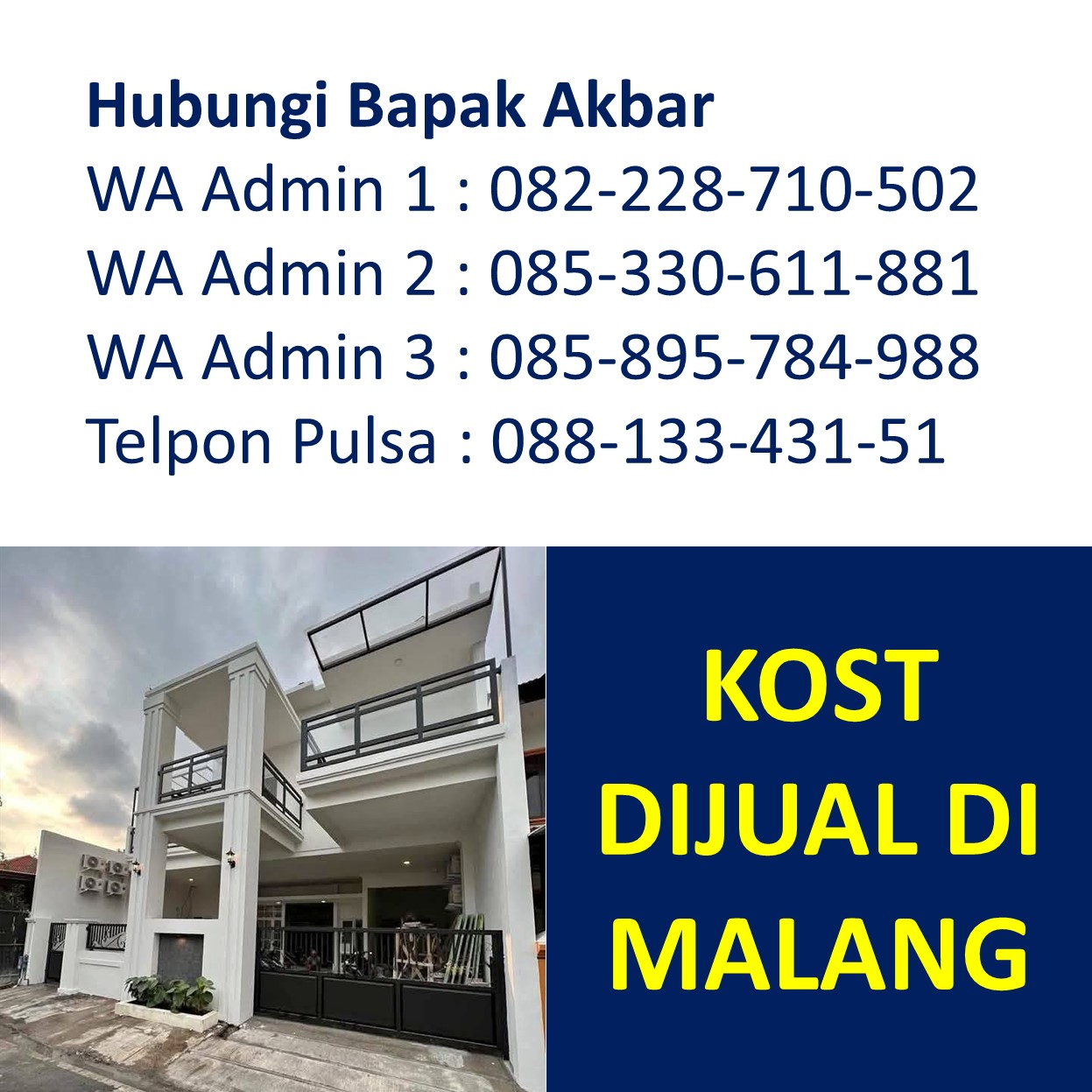 Bapak Akbar menyediakan beragam informasi tentang rumah kost dijual di Malang yang berada di kawasan strategis Dekat Universitas Brawijaya UB, Dekat Universitas Islam Negeri UIN Maulana Malik Ibrahim, Dekat Universitas Negeri UM, Dekat UPBJJ Universitas Terbuka, Dekat Universitas Gajayana UNIGA, Dekat Universitas Islam UNISMA, Dekat Universitas Kanjuruhan UNIKAMA, Dekat Universitas Kristen Cipta Wacana UKCW, Dekat Universitas Merdeka UNMER, Dekat Universitas Muhammadiyah UMM, Dekat Universitas Tribhuwana Tunggadewi UNITRI, Dekat Universitas Widyagama UWG, Dekat Universitas Wisnuwardhana, Dekat BINUS University, Dekat Politeknik Negeri POLINEMA, Dekat Politeknik Unisma, Dekat Politeknik Kota POLTEKOM, Dekat Politeknik Kesehatan Kementerian Kesehatan, Dekat Sekolah Tinggi Agama Islam Ma’had Aly Al-Hikam, Dekat Sekolah Tinggi Bahasa Asing, Dekat Sekolah Tinggi Filsafat Theologi STFT Widya Sasana, Dekat Sekolah Tinggi Teologi Salem, Dekat Sekolah Tinggi Teologi Satyabhakti, Dekat Sekolah Tinggi Ilmu Administrasi, Dekat STIE Indocakti, Dekat STIE Indonesia, Dekat STIE Kertanegara STIEKMA, Dekat STIE Koperasi STIEKOP, Dekat STIE kucecwara ABM, Dekat STIE Pemnas Indonesia, Dekat STIEKN Jaya Negara, Dekat STIKes Kendedes, Dekat Stikes Maharani, Dekat STIKES Widyagama Husada, Dekat Sekolah Tinggi Ilmu Hukum Sunan Giri, Dekat Sekolah Tinggi Informatika dan Komputer Indonesia STIKI, Dekat Sekolah Tinggi Pendidikan Agama Kristen STIPAK Duta Harapan, Dekat Sekolah Tinggi Ilmu Perikanan STIP, Dekat STISOSPOL Waskita Dharma, Dekat Sekolah Tinggi Pastoral IPI, Dekat STT Atlas Nusantara, Dekat STT Budi Utomo, Dekat STT, Dekat STT RRI, Dekat STMIK PPKIA Pradnya Paramita STIMATA, Dekat Akademi Analis Farmasi dan Makanan AKAFARMA Putra Indonesia, Dekat Akademi Analis Kesehatan, Dekat Akademi Farmasi AKFAR Putra Indonesia, Dekat Akademi Kebidanan Brawijaya Husada, Dekat Akademi Kebidanan Wira Husada Nusantara, Dekat Akademi Kebidanan Wijaya Kusuma, Dekat Akademi Keperawatan Panti Waluya, Dekat Akademi Pariwisata dan Perhotelan APARTEL Ganesha, Dekat Institut Teknologi Nasional ITN, Dekat IKIP Budi Utomo, Dekat Institut Pertanian, Dekat Institut Teknologi dan Bisnis Asia, Dekat Institut Teknologi Sains dan Kesehatan RS dr. Soepraoen Kesdam V