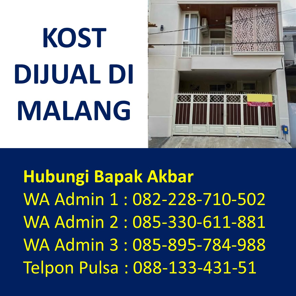 Bapak Akbar menyediakan beragam informasi tentang rumah kost dijual di Malang yang berada di kawasan strategis Dekat Universitas Brawijaya UB, Dekat Universitas Islam Negeri UIN Maulana Malik Ibrahim, Dekat Universitas Negeri UM, Dekat UPBJJ Universitas Terbuka, Dekat Universitas Gajayana UNIGA, Dekat Universitas Islam UNISMA, Dekat Universitas Kanjuruhan UNIKAMA, Dekat Universitas Kristen Cipta Wacana UKCW, Dekat Universitas Merdeka UNMER, Dekat Universitas Muhammadiyah UMM, Dekat Universitas Tribhuwana Tunggadewi UNITRI, Dekat Universitas Widyagama UWG, Dekat Universitas Wisnuwardhana, Dekat BINUS University, Dekat Politeknik Negeri POLINEMA, Dekat Politeknik Unisma, Dekat Politeknik Kota POLTEKOM, Dekat Politeknik Kesehatan Kementerian Kesehatan, Dekat Sekolah Tinggi Agama Islam Ma’had Aly Al-Hikam, Dekat Sekolah Tinggi Bahasa Asing, Dekat Sekolah Tinggi Filsafat Theologi STFT Widya Sasana, Dekat Sekolah Tinggi Teologi Salem, Dekat Sekolah Tinggi Teologi Satyabhakti, Dekat Sekolah Tinggi Ilmu Administrasi, Dekat STIE Indocakti, Dekat STIE Indonesia, Dekat STIE Kertanegara STIEKMA, Dekat STIE Koperasi STIEKOP, Dekat STIE kucecwara ABM, Dekat STIE Pemnas Indonesia, Dekat STIEKN Jaya Negara, Dekat STIKes Kendedes, Dekat Stikes Maharani, Dekat STIKES Widyagama Husada, Dekat Sekolah Tinggi Ilmu Hukum Sunan Giri, Dekat Sekolah Tinggi Informatika dan Komputer Indonesia STIKI, Dekat Sekolah Tinggi Pendidikan Agama Kristen STIPAK Duta Harapan, Dekat Sekolah Tinggi Ilmu Perikanan STIP, Dekat STISOSPOL Waskita Dharma, Dekat Sekolah Tinggi Pastoral IPI, Dekat STT Atlas Nusantara, Dekat STT Budi Utomo, Dekat STT, Dekat STT RRI, Dekat STMIK PPKIA Pradnya Paramita STIMATA, Dekat Akademi Analis Farmasi dan Makanan AKAFARMA Putra Indonesia, Dekat Akademi Analis Kesehatan, Dekat Akademi Farmasi AKFAR Putra Indonesia, Dekat Akademi Kebidanan Brawijaya Husada, Dekat Akademi Kebidanan Wira Husada Nusantara, Dekat Akademi Kebidanan Wijaya Kusuma, Dekat Akademi Keperawatan Panti Waluya, Dekat Akademi Pariwisata dan Perhotelan APARTEL Ganesha, Dekat Institut Teknologi Nasional ITN, Dekat IKIP Budi Utomo, Dekat Institut Pertanian, Dekat Institut Teknologi dan Bisnis Asia, Dekat Institut Teknologi Sains dan Kesehatan RS dr. Soepraoen Kesdam V