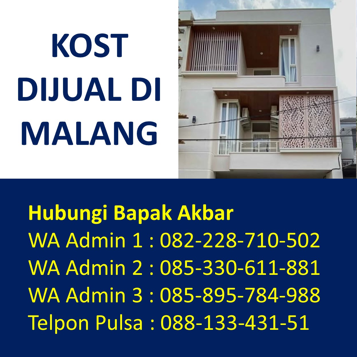 Bapak Akbar menyediakan beragam informasi tentang rumah kost dijual di Malang yang berada di kawasan strategis Dekat Universitas Brawijaya UB, Dekat Universitas Islam Negeri UIN Maulana Malik Ibrahim, Dekat Universitas Negeri UM, Dekat UPBJJ Universitas Terbuka, Dekat Universitas Gajayana UNIGA, Dekat Universitas Islam UNISMA, Dekat Universitas Kanjuruhan UNIKAMA, Dekat Universitas Kristen Cipta Wacana UKCW, Dekat Universitas Merdeka UNMER, Dekat Universitas Muhammadiyah UMM, Dekat Universitas Tribhuwana Tunggadewi UNITRI, Dekat Universitas Widyagama UWG, Dekat Universitas Wisnuwardhana, Dekat BINUS University, Dekat Politeknik Negeri POLINEMA, Dekat Politeknik Unisma, Dekat Politeknik Kota POLTEKOM, Dekat Politeknik Kesehatan Kementerian Kesehatan, Dekat Sekolah Tinggi Agama Islam Ma’had Aly Al-Hikam, Dekat Sekolah Tinggi Bahasa Asing, Dekat Sekolah Tinggi Filsafat Theologi STFT Widya Sasana, Dekat Sekolah Tinggi Teologi Salem, Dekat Sekolah Tinggi Teologi Satyabhakti, Dekat Sekolah Tinggi Ilmu Administrasi, Dekat STIE Indocakti, Dekat STIE Indonesia, Dekat STIE Kertanegara STIEKMA, Dekat STIE Koperasi STIEKOP, Dekat STIE kucecwara ABM, Dekat STIE Pemnas Indonesia, Dekat STIEKN Jaya Negara, Dekat STIKes Kendedes, Dekat Stikes Maharani, Dekat STIKES Widyagama Husada, Dekat Sekolah Tinggi Ilmu Hukum Sunan Giri, Dekat Sekolah Tinggi Informatika dan Komputer Indonesia STIKI, Dekat Sekolah Tinggi Pendidikan Agama Kristen STIPAK Duta Harapan, Dekat Sekolah Tinggi Ilmu Perikanan STIP, Dekat STISOSPOL Waskita Dharma, Dekat Sekolah Tinggi Pastoral IPI, Dekat STT Atlas Nusantara, Dekat STT Budi Utomo, Dekat STT, Dekat STT RRI, Dekat STMIK PPKIA Pradnya Paramita STIMATA, Dekat Akademi Analis Farmasi dan Makanan AKAFARMA Putra Indonesia, Dekat Akademi Analis Kesehatan, Dekat Akademi Farmasi AKFAR Putra Indonesia, Dekat Akademi Kebidanan Brawijaya Husada, Dekat Akademi Kebidanan Wira Husada Nusantara, Dekat Akademi Kebidanan Wijaya Kusuma, Dekat Akademi Keperawatan Panti Waluya, Dekat Akademi Pariwisata dan Perhotelan APARTEL Ganesha, Dekat Institut Teknologi Nasional ITN, Dekat IKIP Budi Utomo, Dekat Institut Pertanian, Dekat Institut Teknologi dan Bisnis Asia, Dekat Institut Teknologi Sains dan Kesehatan RS dr. Soepraoen Kesdam V