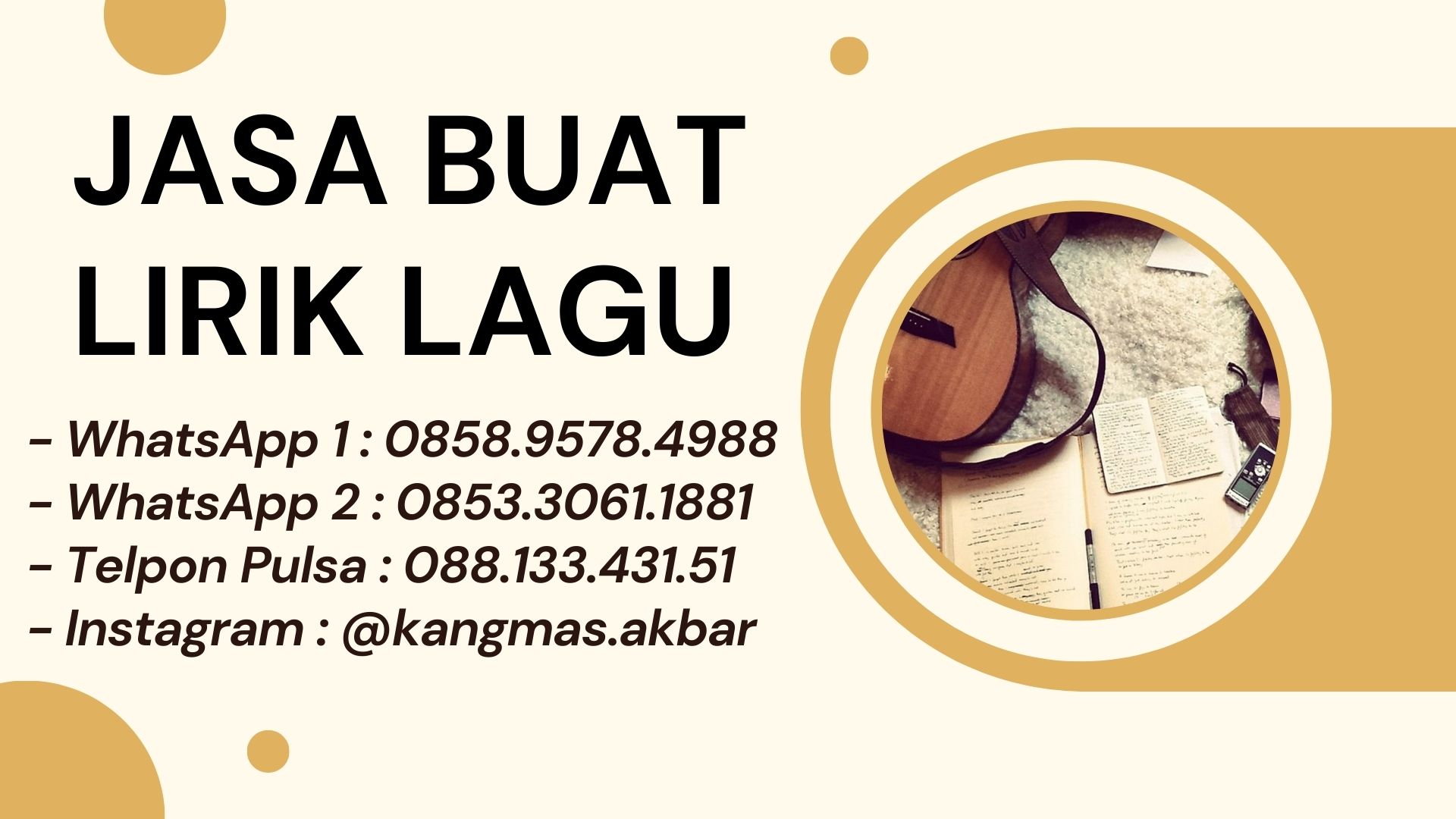 Mas Akbar siap membuatkan lirik lagu untuk berbagai genre musik (Indie, Jazz, Reggae, EDM, Hiphop, Keroncong, Pop, Rock, Dangdut)