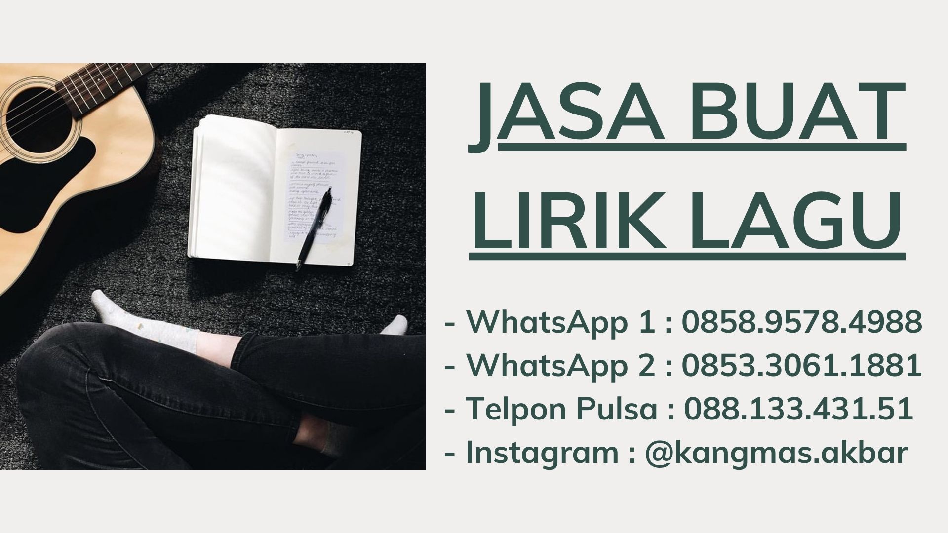 Mas Akbar siap membuatkan lirik lagu untuk berbagai genre musik (Indie, Jazz, Reggae, EDM, Hiphop, Keroncong, Pop, Rock, Dangdut)