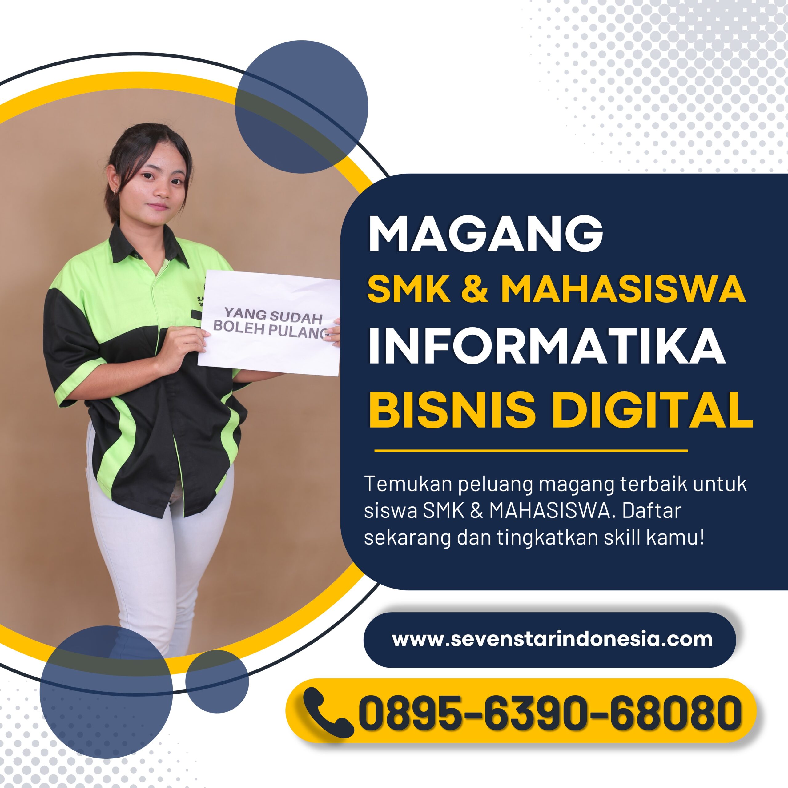 Untuk informasi pendaftaran dan pertanyaan lainnya, hubungi 0895-6390-68080. Jadikan waktu magangmu bermakna bersama Sevenstar Digital ID, tempat ideal belajar dunia IT secara nyata dan profesional.