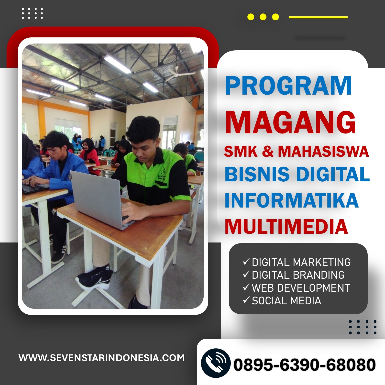 WA 0895-6390-68080,Sevenstar Digital ID membuka lowongan PKL untuk jurusan Manajemen Pemasaran di Malang. Kami mencari mahasiswa/i yang tertarik untuk mengembangkan keterampilan dalam pemasaran digital, analisis pasar, dan pengelolaan media sosial. Program ini menawarkan pengalaman langsung bekerja dengan tim profesional di bidang pemasaran digital. Lokasi di Malang, Indonesia, memberikan kesempatan belajar yang fleksibel dan mendalam. Untuk informasi lebih lanjut atau melamar, hubungi kami melalui WhatsApp di 0895-6390-68080. Jangan lewatkan kesempatan berharga ini untuk mengasah keterampilan Anda di dunia pemasaran digital bersama Sevenstar Digital ID. Daftar sekarang dan mulai perjalanan karier Anda!.