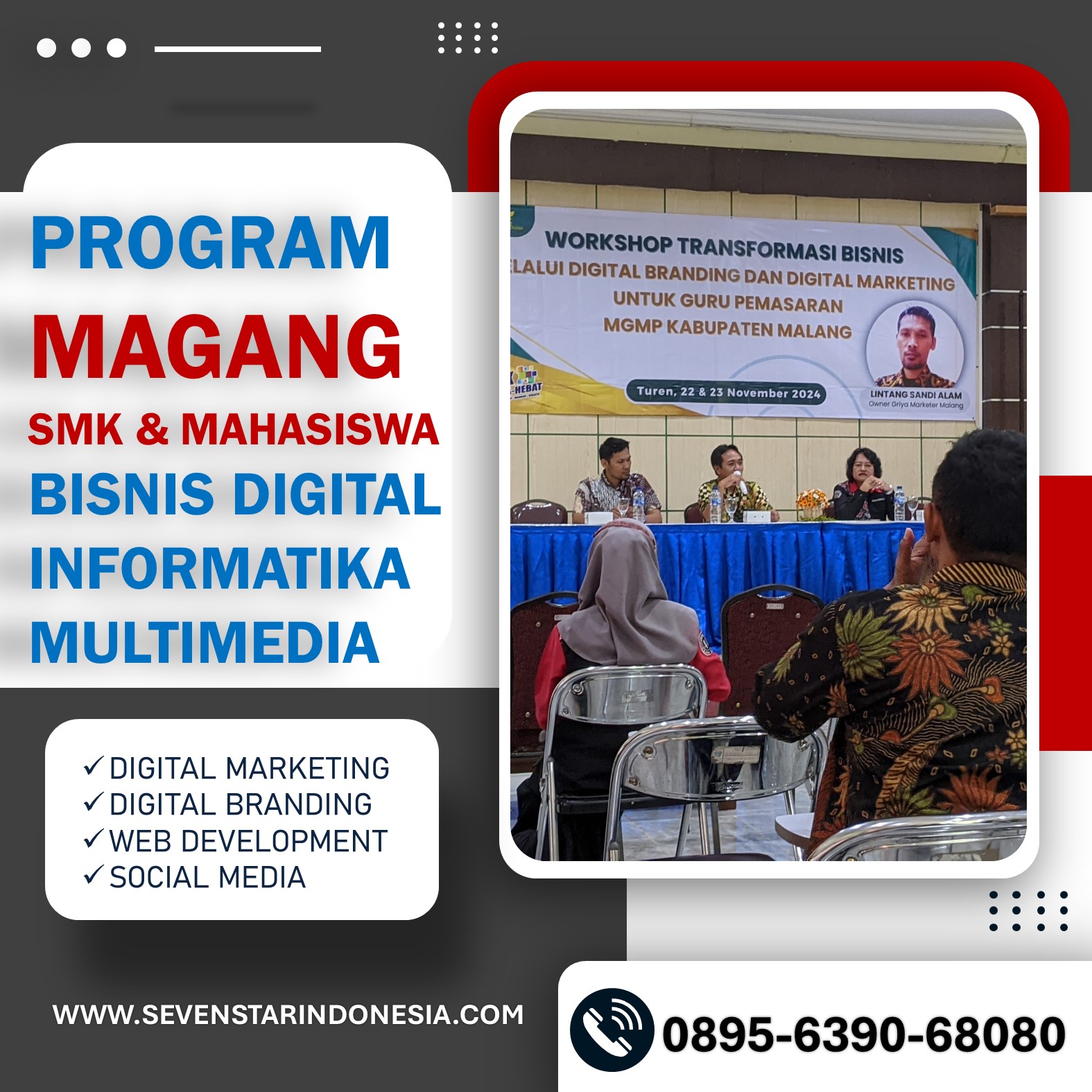 Jangan lewatkan kesempatan untuk bergabung dengan Sevenstar Digital ID dan kembangkan keterampilan pemasaran digital Anda melalui program prakerin di Malang. Daftarkan diri Anda segera dengan menghubungi 0895-6390-68080 untuk informasi lebih lanjut.